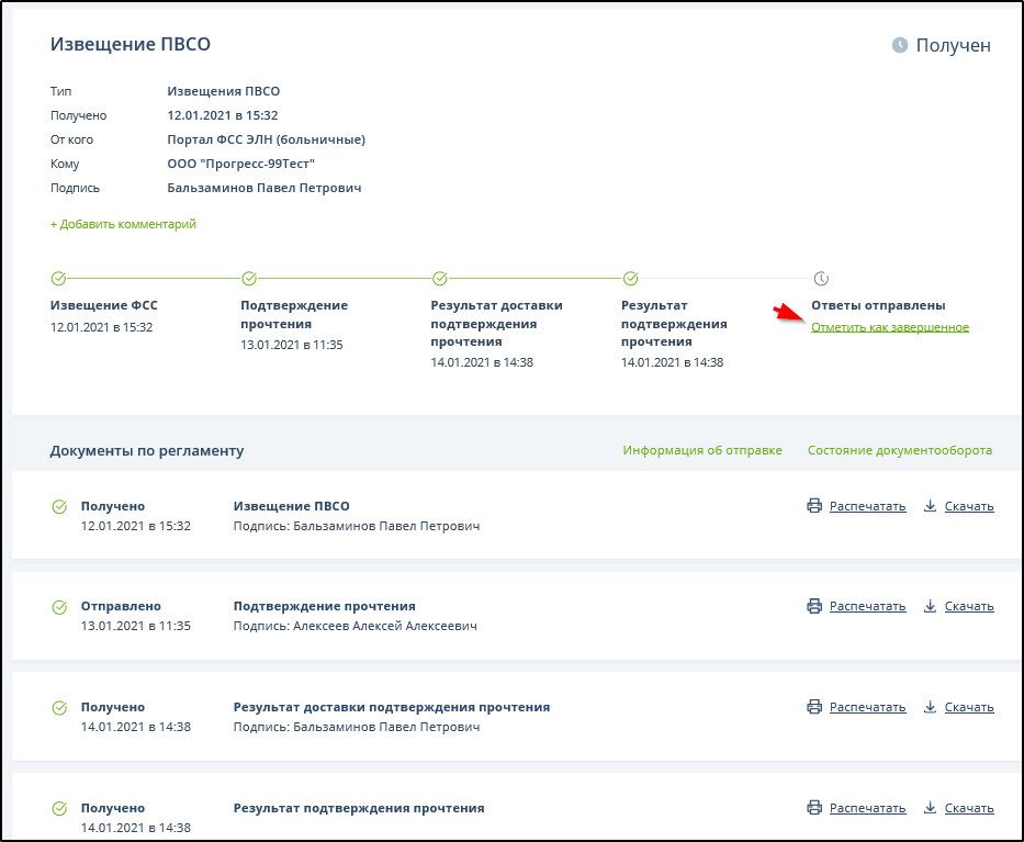 На формирование и отправку подтверждения прочтения Извещения ПВСО отводится один рабочий день. Если в этот срок подтверждение прочтения не будет отправлено, то ФСС направит это Извещение ПВСО страхователю в бумажной форме.