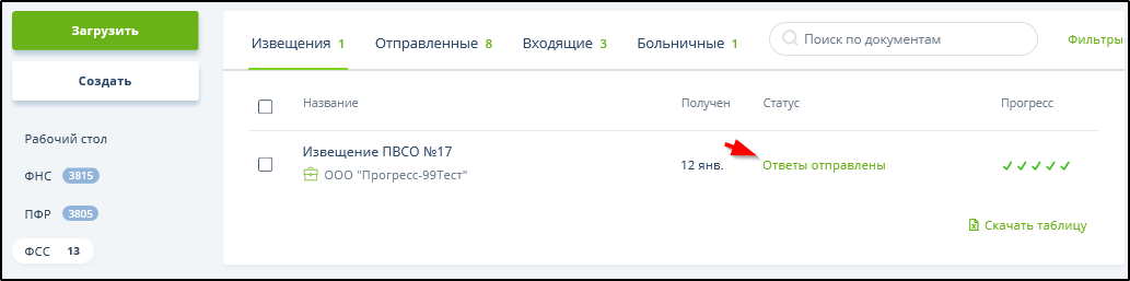 В результате этого статус Извещения ПВСО примет значение "Ответы отправлены". Пример: