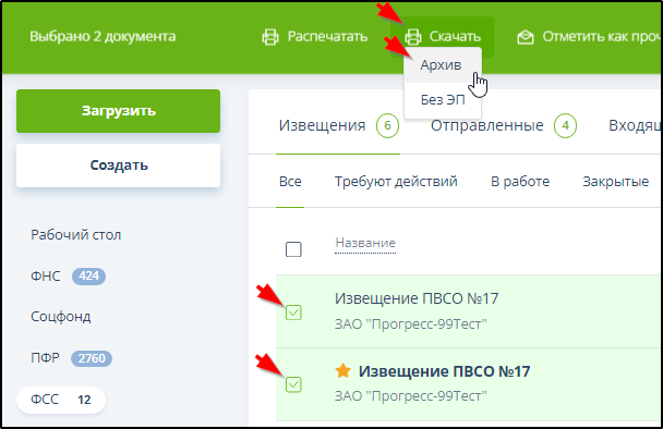 Пример скачивания двух отмеченных галочками документов в виде zip архива:
