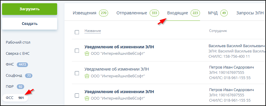 Информация о поступивших уведомлениях об изменении статуса ЭЛН отображается в подразделе "ФСС" - "Входящие".