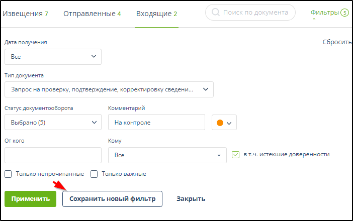 Если в дальнейшем примененные настройки фильтрации будут полезны, то для их сохранения и формирования закладки результатов применения, - нажать кнопку "Сохранить новый фильтр" и указать название закладки для результатов применения фильтра. Пример: