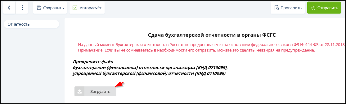 • С помощью кнопки "Загрузить" выбрать подготовленный для ФНС xml-файл годовой бухгалтерской отчетности.