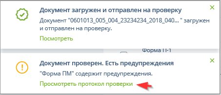 Сообщения об удачной или неудачной загрузке, проверке и отправке сохраняются в Журнале уведомлений, их можно посмотреть, если открыть этот журнал с помощью кнопки "Уведомления".