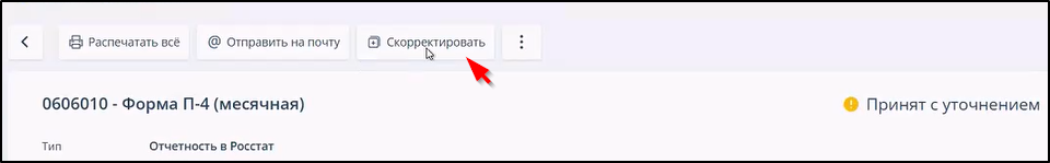 В случае получения от Росстата (ТОГС) уведомления об уточнении, уведомления о несоответствии формату или сообщения об ошибке для получения копии отклонённого документа в качестве черновика можно нажать кнопку "Скорректировать" на панели инструментов: