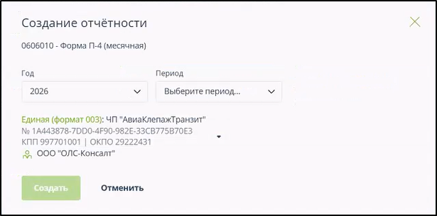 После нажатия кнопки "Скорректировать" открывается окно для выбора года и периода для формируемого документа: