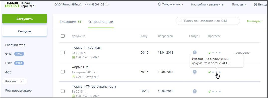 Для осуществления контроля нужно открыть подраздел "Отправленные" раздела "Росстат".