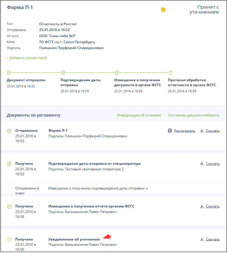 Для уточнения информации об ошибках, допущенных в отправленном документе, или содержания уведомления об уточнении нужно в списке отправленных и полученных сообщений щелкнуть левой кнопкой мыши по соответствующей ссылке. Пример: