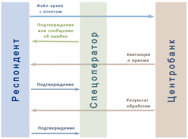 После отправки отчёта респондент должен получить от Оператора связи подтверждение о дате и времени отправки сведений или сообщение об ошибке. Затем, если отчёт не содержит ошибок, респондент должен получить из Центробанка: