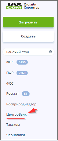 Предоставление возможности отправки документов в Центробанк является отдельной услугой. Если эта услуга доступна, то в главном меню отображен раздел "Центробанк".