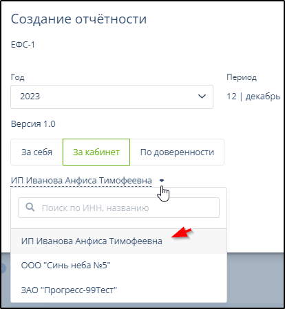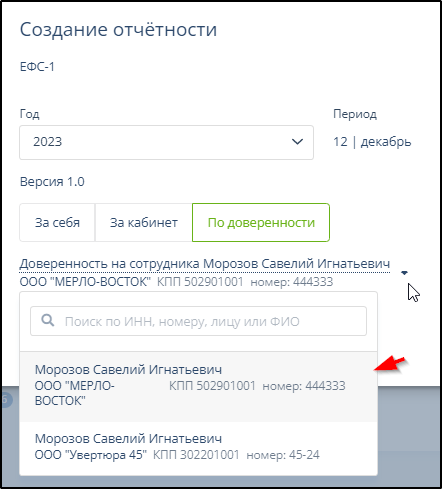 Выбрать в открывшемся списке данные организации, филиала, предоставившего доверенность, или лица, указанного в кабинете или доверенности. Примеры: