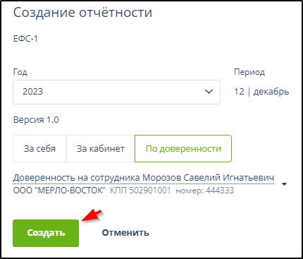 Кнопки "За кабинет" и "По доверенности" отображаются только при наличии введенных сведений о присоединенных кабинетах и действующих доверенностях (см. п. 6.1.3). При необходимости использовать при формировании документа сведения кабинета или доверенности нужно: