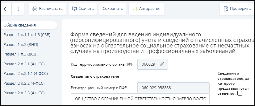 Если для пользователя в системе зарегистрировано несколько направлений обмена с ПФР, то на панели инструментов справа от кнопки может отображаться меню для выбора регистрационного номера страхователя и филиала ПФР по первым шести цифрам регистрационного номера страхователя.
