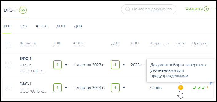 Результат ЭДО отображается значком в колонке "Статус". Пример: