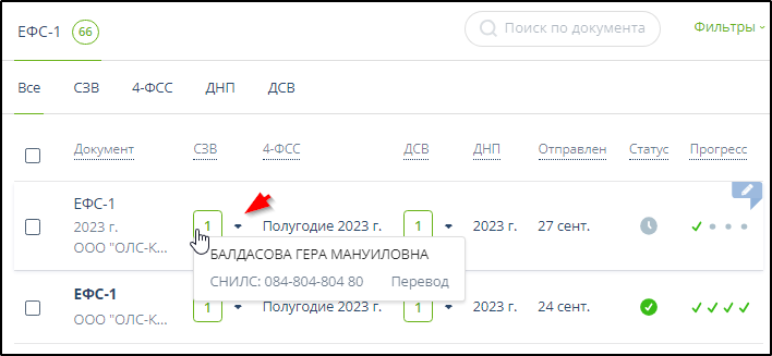 Колонки списка документооборотов в разделе "Соцфонд (2023)" отражают заполнение соответствующих разделов или подраздела в отправленных документах ЕФС-1.