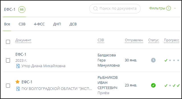 В этом разделе "Соцфонд" представлен список отправленных документов с отображением информации об их статусе и стадии обработки.
