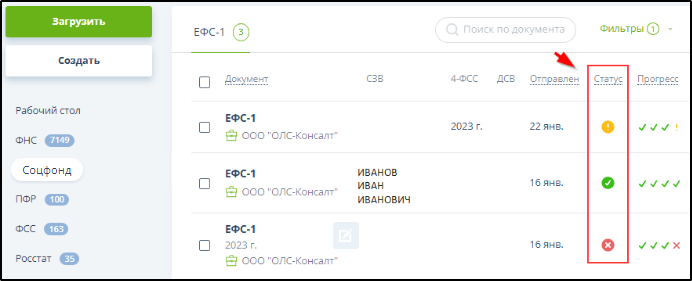 Для документооборота отчётности Соцфонда значки в колонке "Статус" имеют следующий смысл: